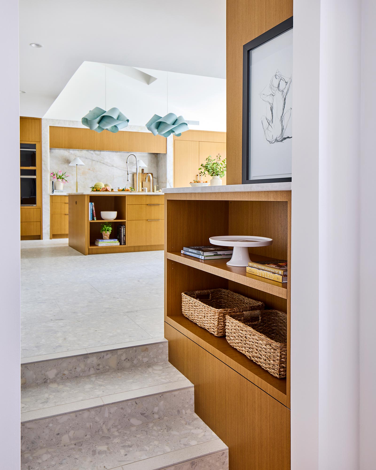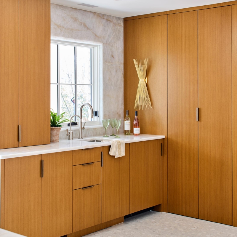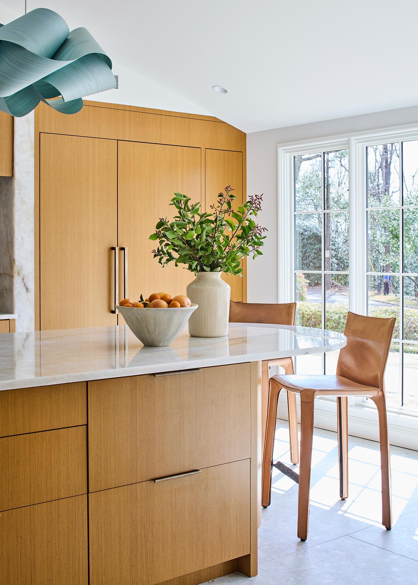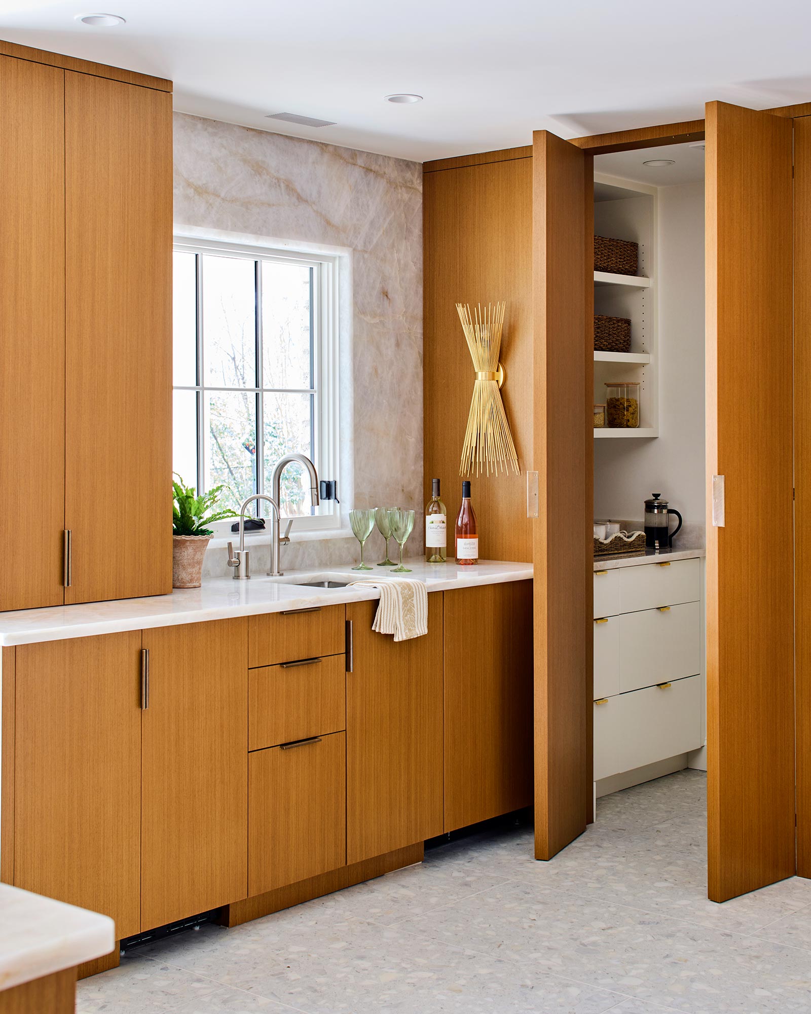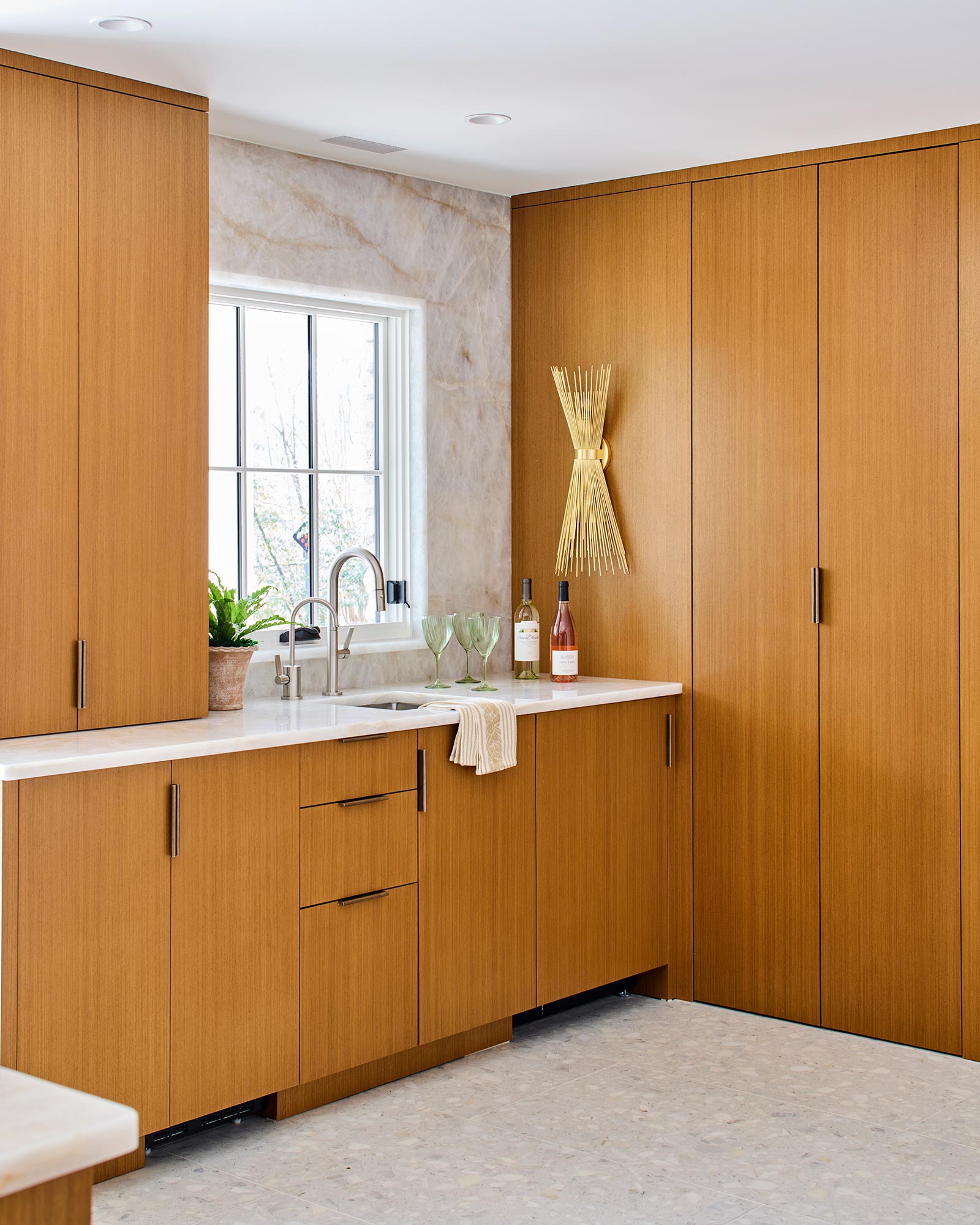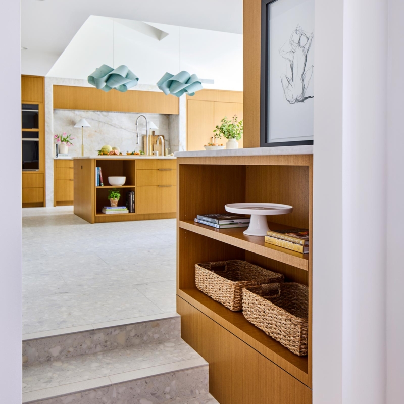 Hardworking finishes, quartzite and commercial grade terrazzo tile, are paired with sleek cabinetry and hidden appliances, elegantly enhancing both form and function. The result is an airy, modern kitchen with space that works for this busy family to gather, connect, and relax – and has lots and lots of light!
