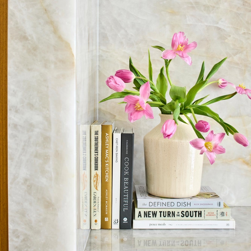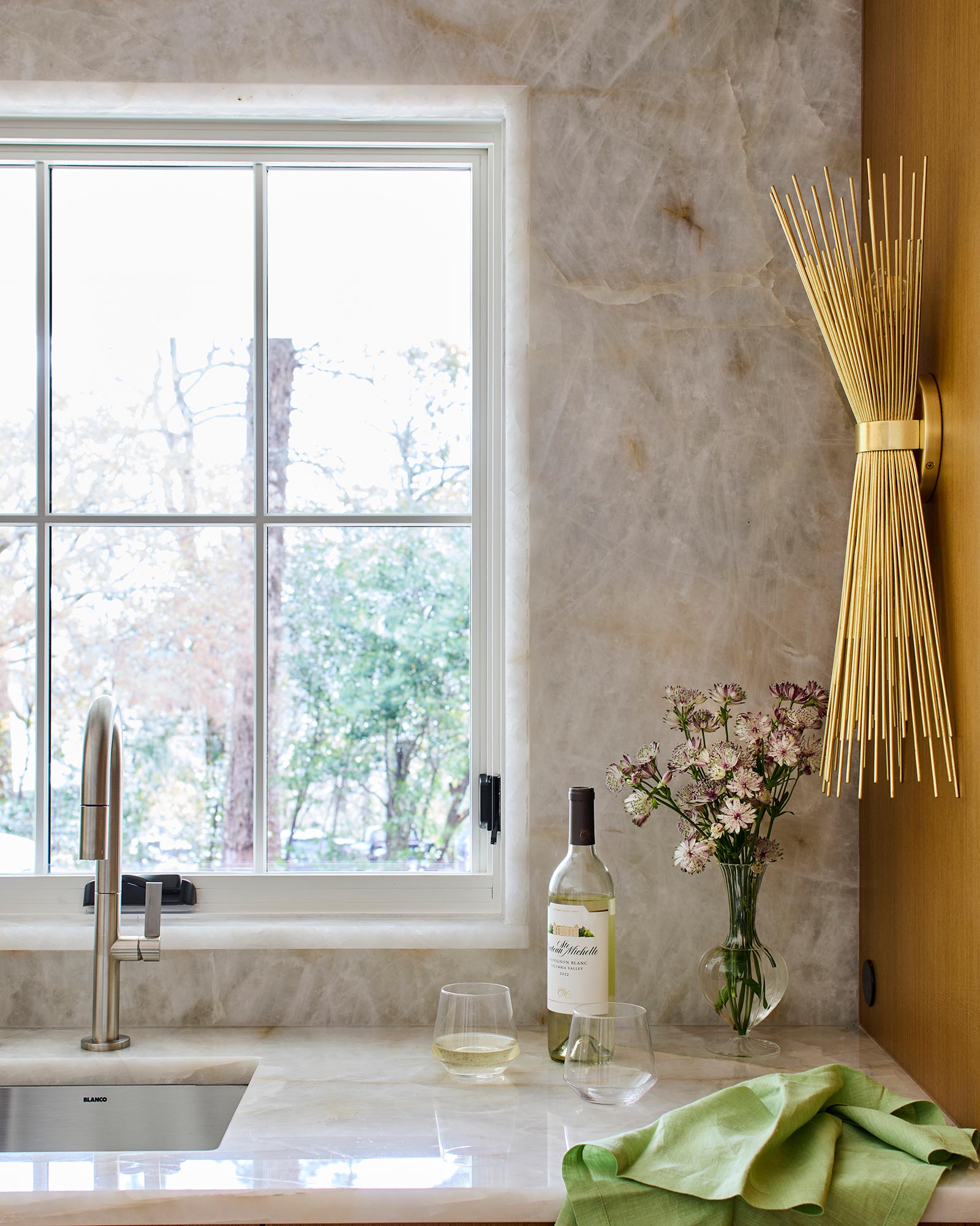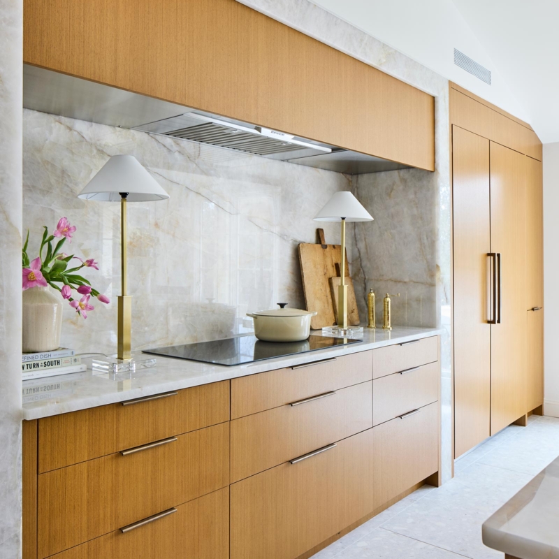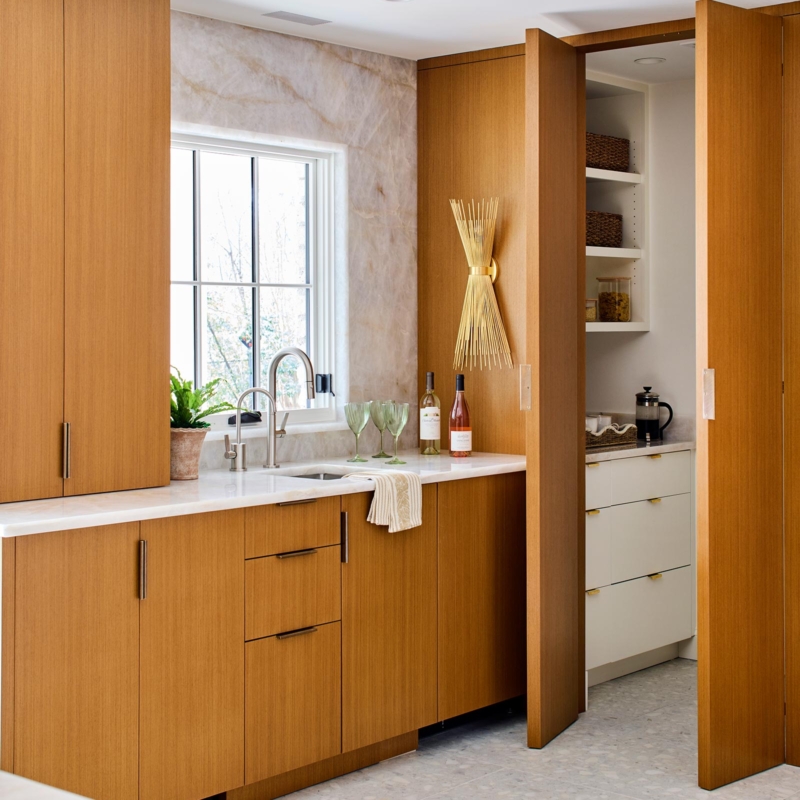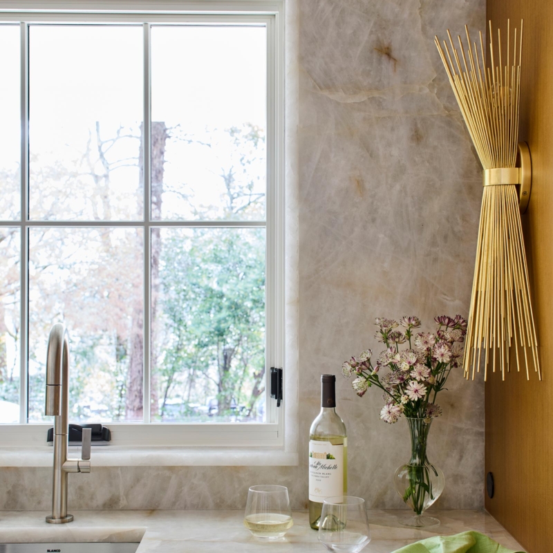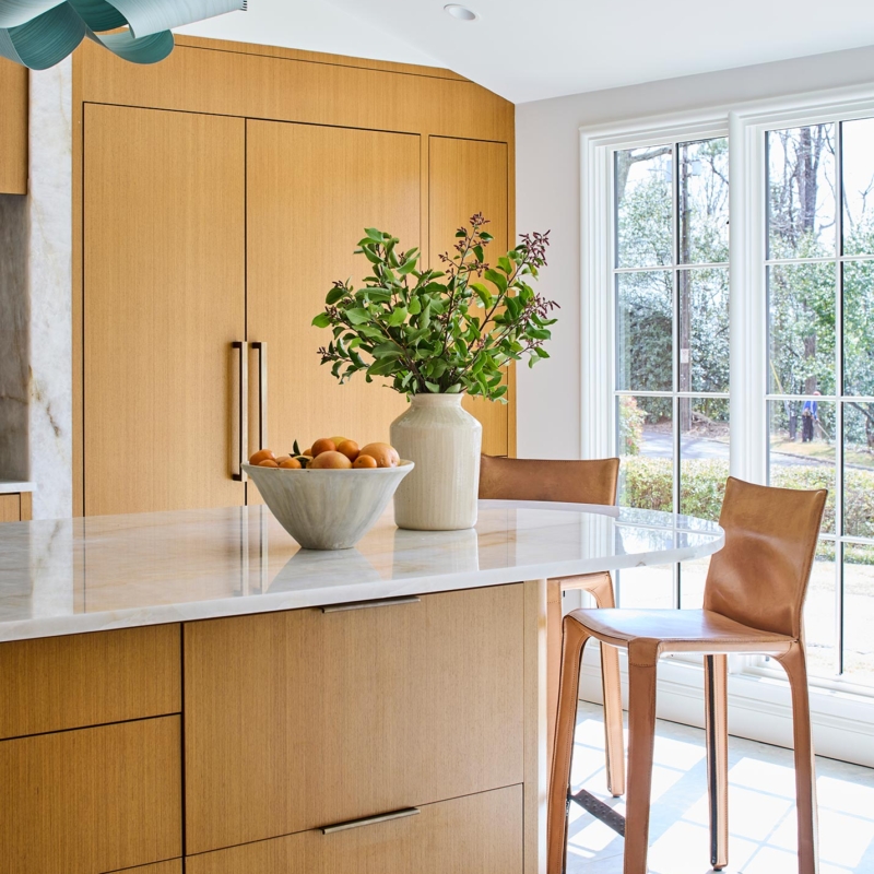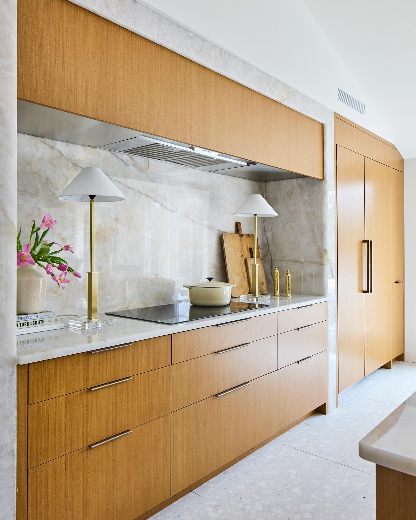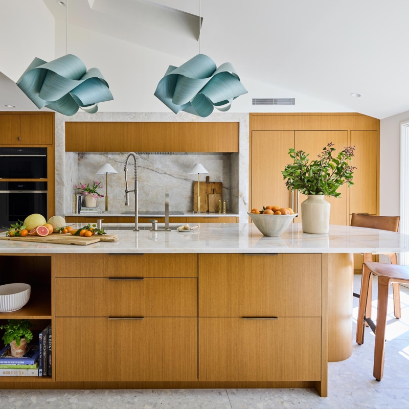 Hardworking finishes, quartzite and commercial grade terrazzo tile, are paired with sleek cabinetry and hidden appliances, elegantly enhancing both form and function. The result is an airy, modern kitchen with space that works for this busy family to gather, connect, and relax – and has lots and lots of light!