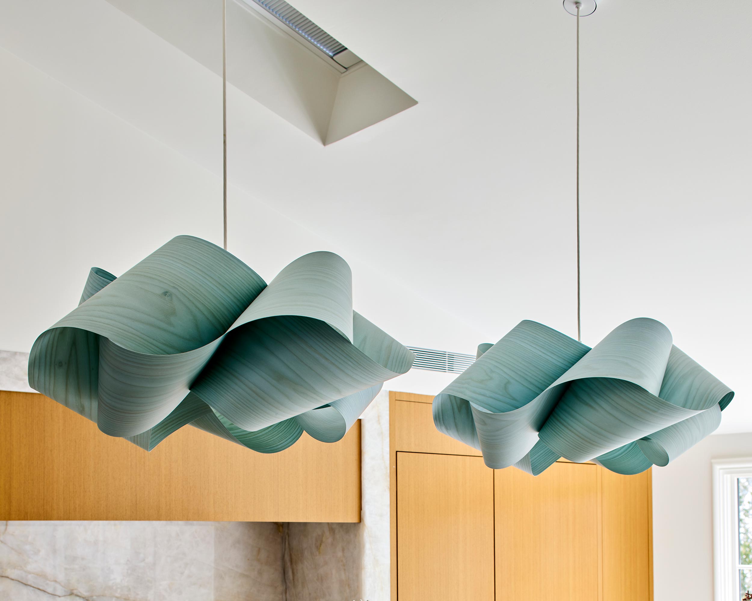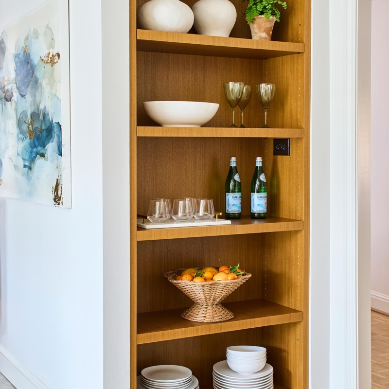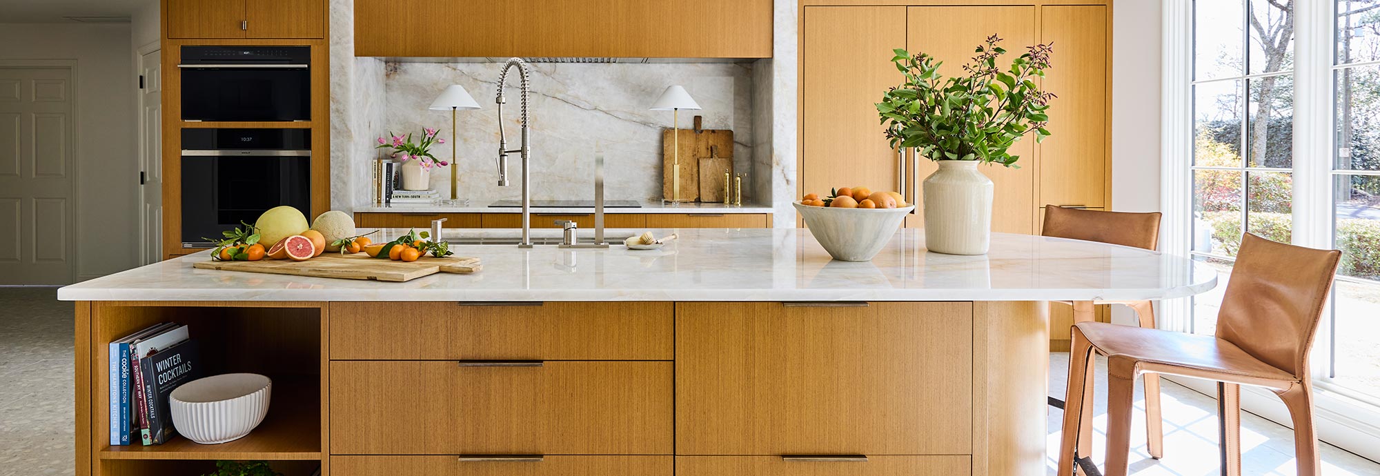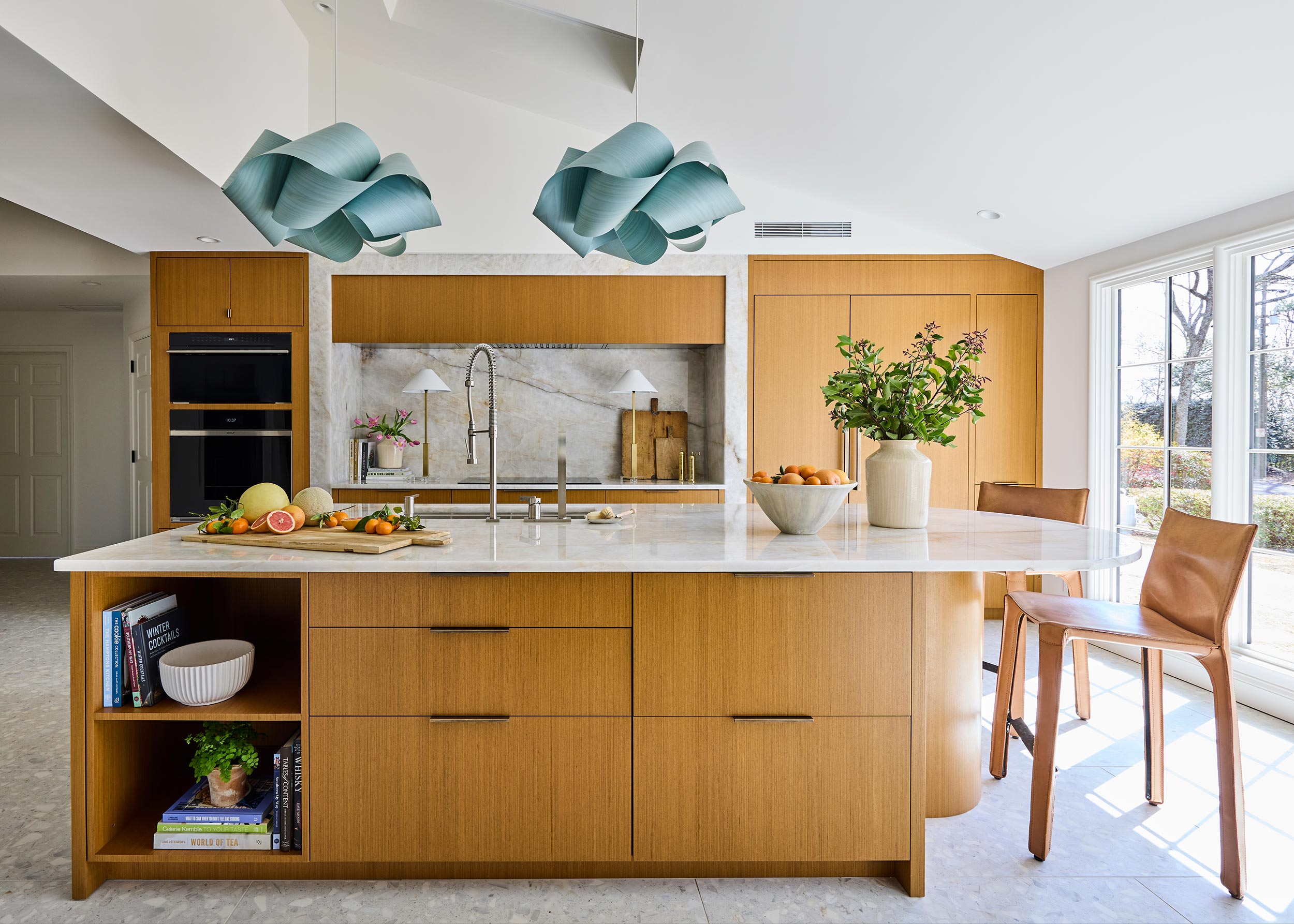 With ample space in this mid-century construction for a gracious family kitchen that works just as well for entertaining, the new space is functional, beautiful, and full of light! A set of new windows and door provide entry from the front porch, and the low ceiling was opened up to provide a home for new skylights over the lozenge-shaped multi-function island.